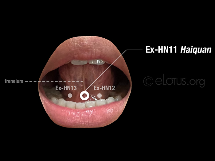 In the center of the frenulum of the tongue between Jinjin and Yuyue.