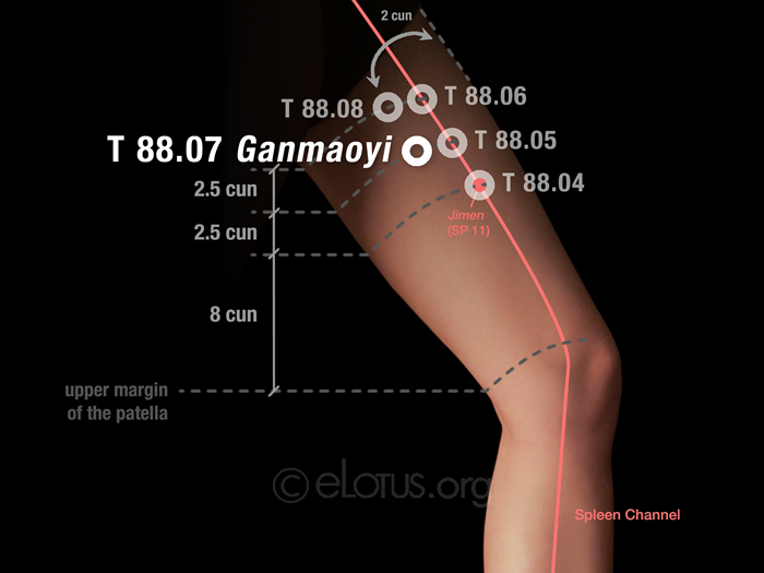 This point is on the SP channel, 10.5 cun proximal to the upper margin of the patella and 2 cun medial to the anterior midline of the thigh. It is 1 cun medial to Jiemeier (T 88.05).