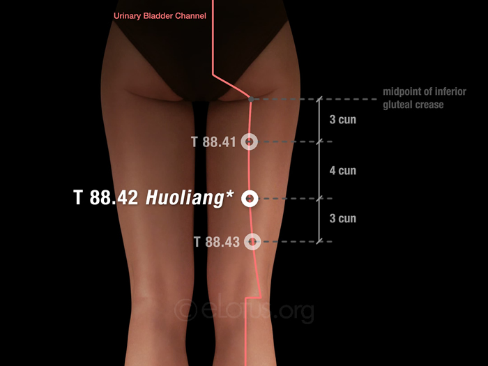 This point is on the BL channel, 7 cun inferior to the midpoint of the inferior gluteal crease.